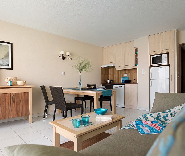 Le coin cuisine est entièrement équipé de 2 ou 4 plaques électrique, d'une hotte aspirante, d'un réfrigérateur, d'un micro-ondes ou four électrique selon les appartements, d'un lave-vaisselle et d'une cafetière électrique.