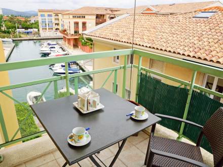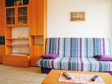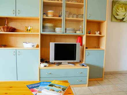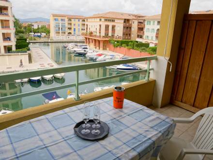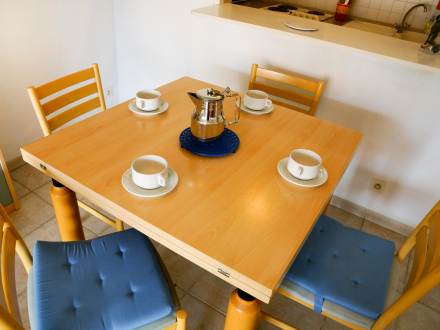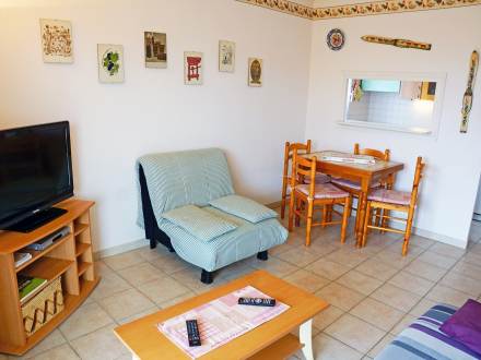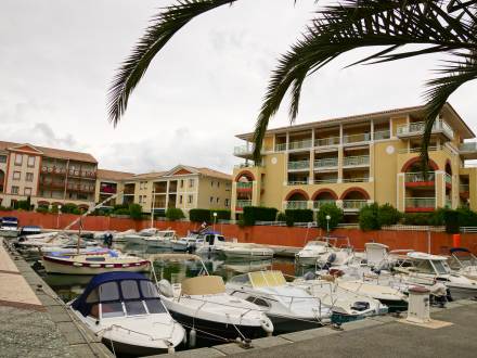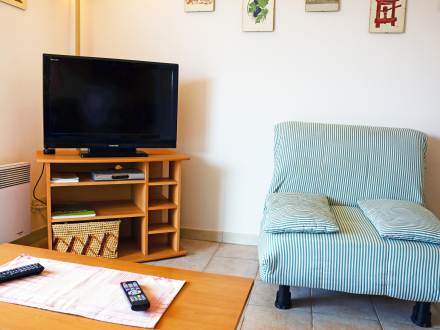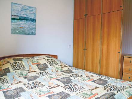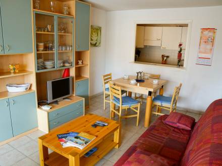 Apt 2 pièces 40 m2 au 2ème étage, situation sud-ouest, aménagement agréable: séjour/salle à manger avec 1 divan-lit double (160 cm, longueur 200 cm), TV (écran plat), radio et DVD. Sortie sur la terrasse. 1 chambre avec 2 lits (90 cm, longueur 190 cm). Sortie sur la terrasse. Cuisine ouverte (4 plaques de cuisson, four, lave-vaisselle, four micro-ondes, congélateur). Douche/WC. Chauffage (en sus). Terrasse 10 m2. Meubles de terrasse. Vue sur le port. A disposition: lave-linge. Garage No 8. Veuillez noter: logement pour non fumeurs. 1 animal domestique de petite taille toléré 1 animal/ chien autorisé.