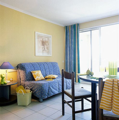 Studio équipé d'une kitchenette avec 4 plaques chauffantes, réfrigérateur, four, lave-vaisselle et cafetière électrique. Téléphone (payant). Télévision (incluse). Loggia ou balcon avec mobilier de jardin.A noter: Le couchage en hauteur ne convient pas à des enfants de moins de 6 ans.