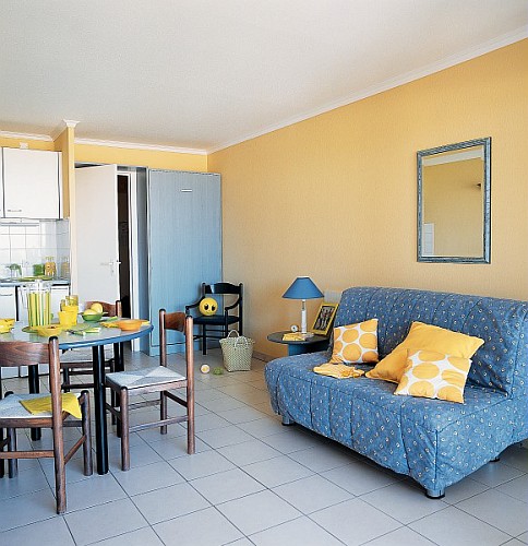 Pour avoir plus de détails et réserver cet hébergement, choisissez une date ci-dessus et cliquez sur voir l'offre ! Vous serez redirigé vers le site proposant la location.Appartement de 2 pièces de 34m² 4 à 6 personnes comprenant un séjour avec 1 banquette lit simple avec lit gigogne ou 2 banquettes lits simples, une chambre avec 2 lits simples ou 1 lit double, une cabine avec deux lits superposés vue mer, une salle de bains avec WC séparés et un coin cuisine.