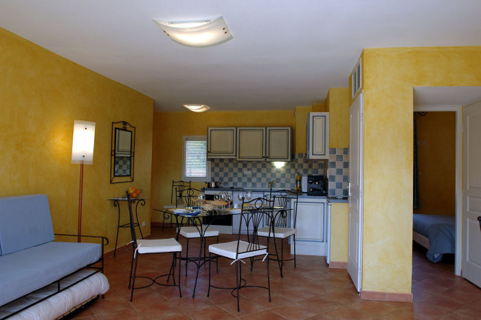 Appartement pour 3 Personnes composé d'un séjour avec un canapé-lit gigogne, d'une chambre avec lit double ou 2 lits simples, d'une kitchenette équipée, d'une salle de bain avec WC séparés ou d'une salle de douche avec WC.
