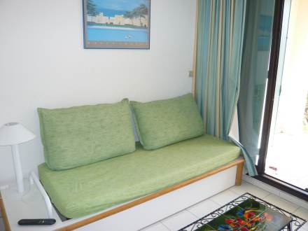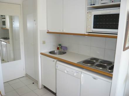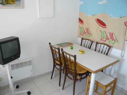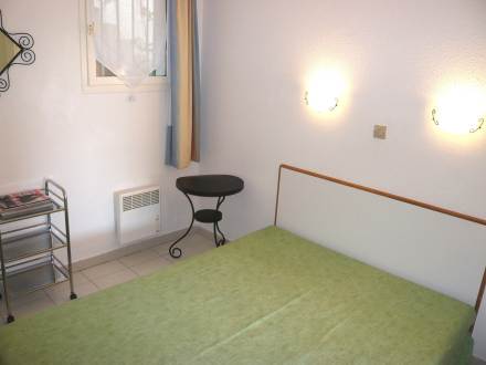 Apt 2 pièces 28 m2, au rez-de-chaussée: séjour/salle à manger avec 1 lit gigogne et TV. 1 chambre avec 1 grand-lit. Coin cuisine (4 plaques de cuisson, four, lave-vaisselle). Bain/WC. Terrasse 7 m2, couverte. Meubles de terrasse. Maximum 1 animal/ chien autorisé. Jardinet non clos.