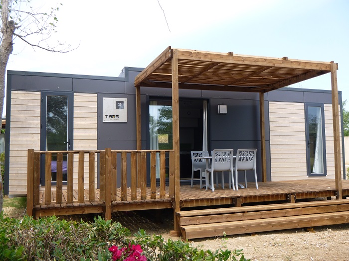 Cottage 3 pièces 4 personnes de 28m² composé d'un séjour avec un couchage d'appoint deux places, d'un coin repas, d'une cuisine équipée, d'une chambre avec un lit double, d'une seconde chambre avec deux lits simples, d'une salle de bain avec WC séparés et d'une terrasse en bois.