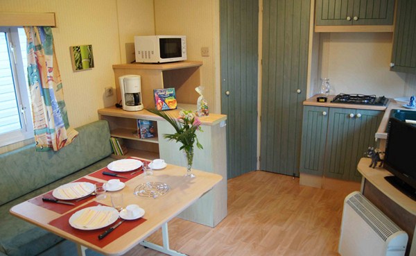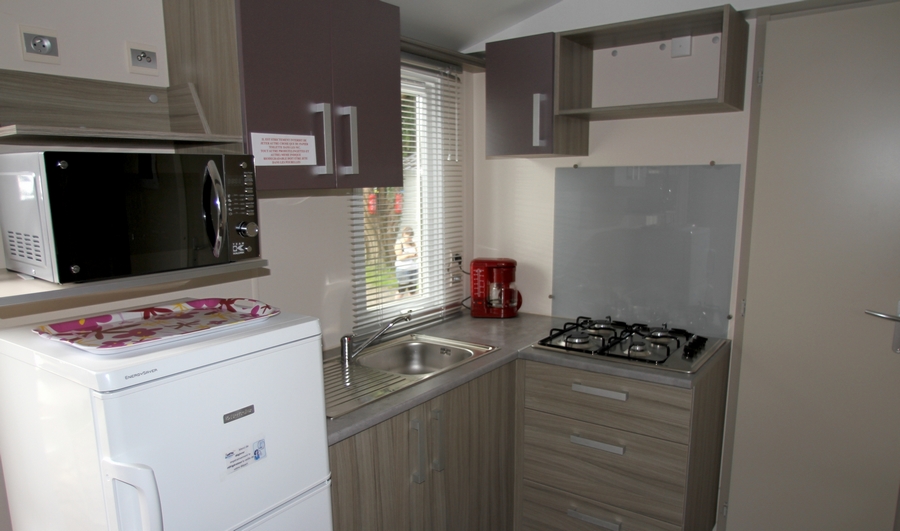 Le mobil home est équipé d'une plaque de cuisson 4 feux, d'un réfrigérateur, d'un micro-ondes, d'une cafetière électrique et de tous les ustensiles de cuisine.Les couvertures et oreillers sont fournis (draps non fournis).La terrasse possède un salon de jardin et un parasol.