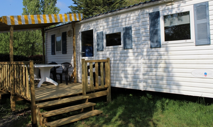 Mobil Home de 24m² de 3 pièces pouvant accueillir 4 personnes. Il est composé d'un séjour avec coin cuisine équipé, d'une chambre avec 1 lit double (140cm), d'une chambre avec 2 lits simples (80cm) et d'une salle de bain avec douche et toilettes séparés. Terrasse couverte.