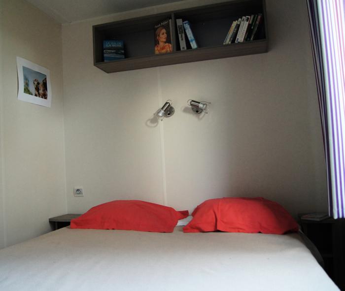 Mobil Home de 28m² de 3 pièces pouvant accueillir 5 à 7 personnes. Il est composé d'un séjour avec un canapé convertible pour 2 personnes (140cm), d'un chambre avec 1 lit double (140cm), d'une chambre avec 3 lits simples (80cm) dont 1 superposé et d'une salle de bain avec toilettes séparés.