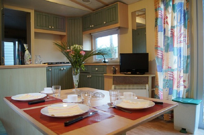Mobil Home de 27m² de 3 pièces pouvant accueillir 4 à 6 personnes.Il est composé d'un séjour avec un canapé convertible pour 2 personnes (140cm), d'un coin cuisine équipé, d'une chambre avec 1 lit double (140cm), d'une chambre avec 2 lits simples (80cm) et d'une salle bain avec douche et toilettes séparés.