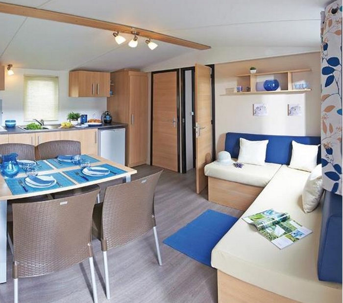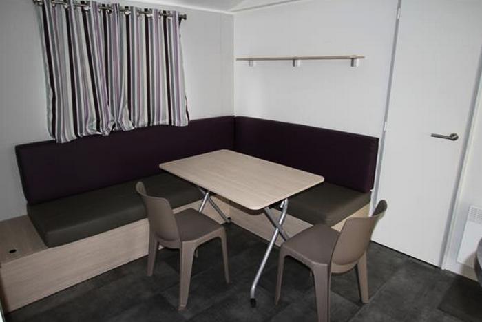 Mobil Home 3 Pièces 4 Personnes d'environ 29m² composé d'un coin cuisine équipée, d'un coin salon avec télévision, d'une chambre avec 1 lit double, d'une chambre avec 2 lits simples, d'une salle de douche et de WC. Terrasse en bois de 11m².