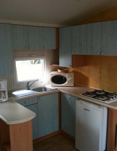 Le Mobil Home comprend un coin cuisine équipée avec réfrigérateur, 4 feux gaz, cafetière, micro-ondes, vaisselle, ustensiles de cuisine. La terrasse dispose d'un salon de jardin.