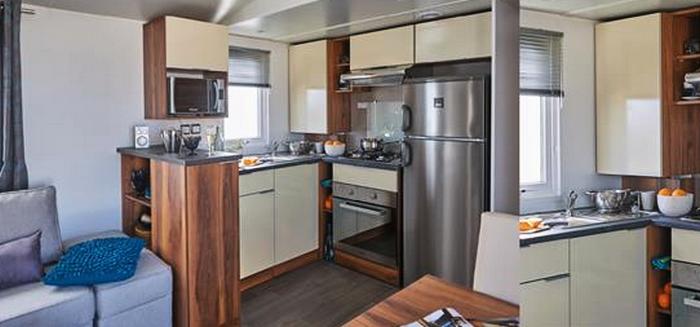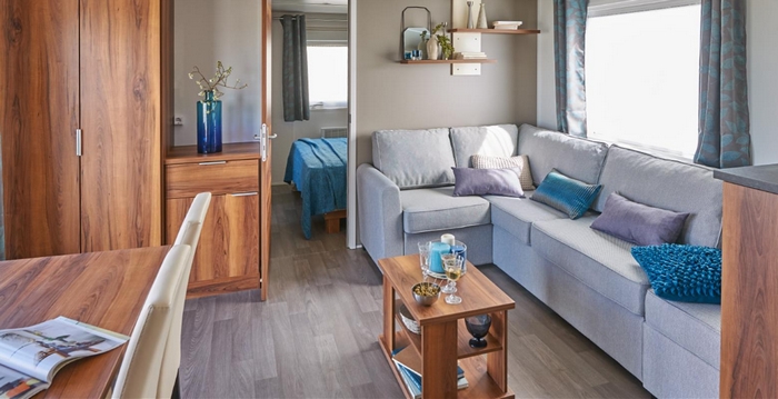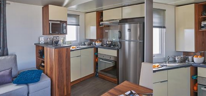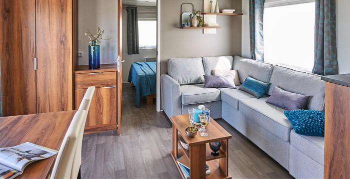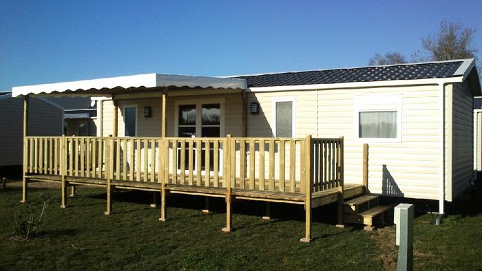 Mobil Home 3 Pièces 4 Personnes d'environ 27m² composé d'un coin cuisine équipée, d'un coin salon avec télévision, d'une chambre avec 1 lit double, d'une chambre avec 2 lits simples, d'une salle de douche et de WC. Terrasse en bois de 11m².