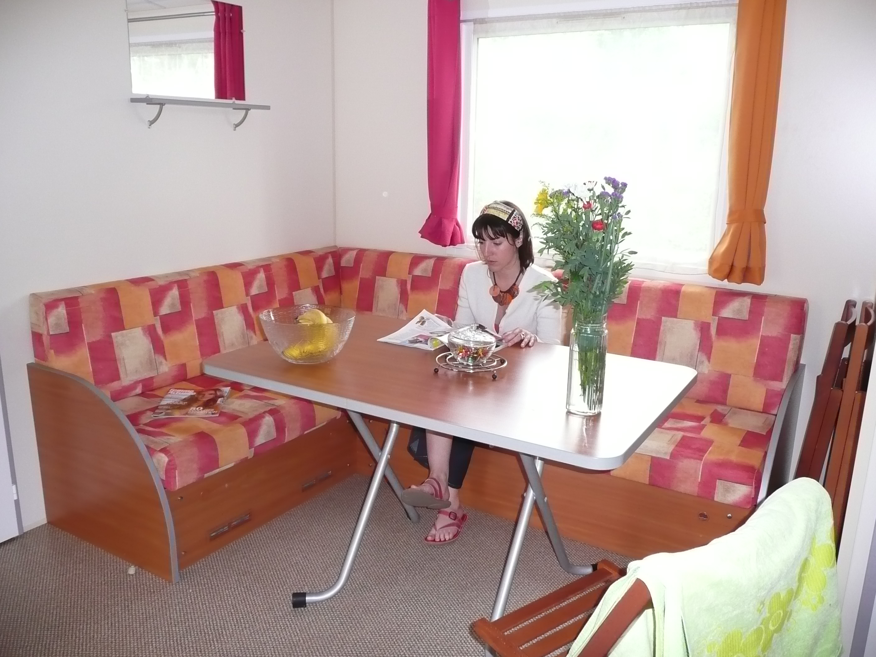 Le mobil-home est équipé d'une plaque avec feux de cuisson, d'un réfrigérateur avec une partie congélateur, d'un micro-ondes, d'une cafetière électrique et de tous les ustensiles de cuisine.Les chambres disposent des oreillers, des couvertures et des alèses jetables sur demande. Un séchoir à linge est également à votre disposition.La terrasse est équipée d'un salon de jardin et de 2 bains de soleil.