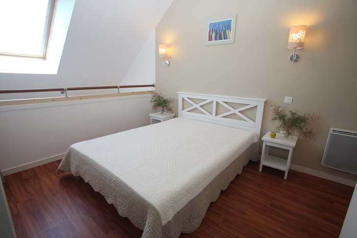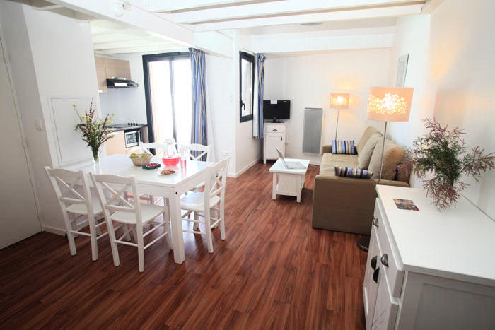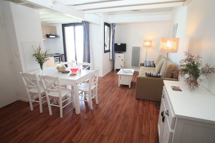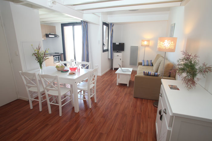 Appartement pour 4 personnes de 31m², composé d'un séjour avec 2 couchages, une chambre avec 1 lit double, d'une kitchenette équipée et d'une salle de bains avec toilettes.