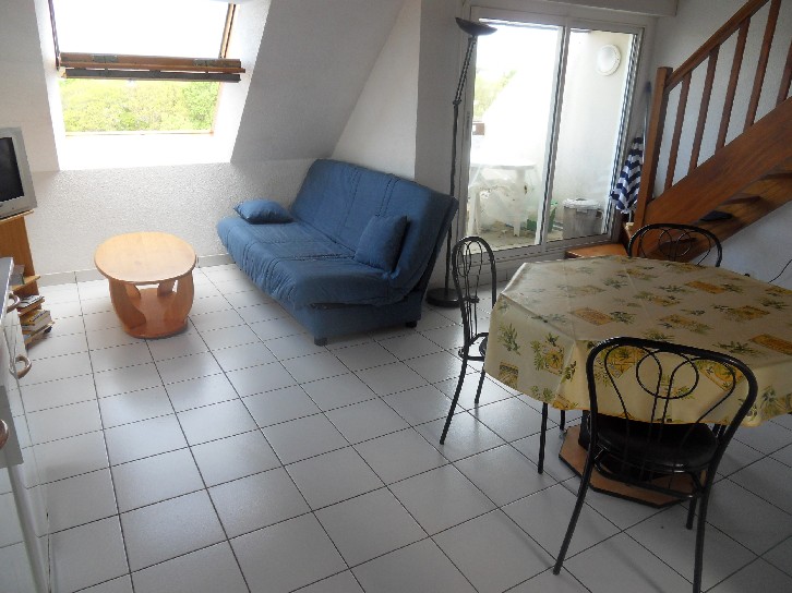 Au 2ème étage de la résidence « Le Clos des Pins», à Guidel-Plages, ce duplex de 50 m² se compose :- D'un séjour avec clic-clac.- Une kitchenette équipée.- Une chambre avec un lit 140.- Une salle de bain avec baignoire et WC. A l'étage:- Une chambre avec deux lits 90. Extérieur:- Petite vue mer depuis le séjour.- Terrasse équipée d'un salon de jardin.Toutes activités nautiques, sentiers côtiers de randonnées et port de plaisance de Guidel à 500 m environ. Tous commerces et services au centre de Guidel à 3,5 km. Bars et restaurants à 500 m.A noter :- Classement officiel 2 * pour 2 personnes avec une capacité d'accueil réel pour 6 personnes.- Linge de lit et de toilette non fourni. Possibilité de location.- électricité en sus sur relevé de compteur de novembre à mars- Le prix de la taxe de séjour variable sera adapté sur place. Nous contacter pour connaître le montant exact.