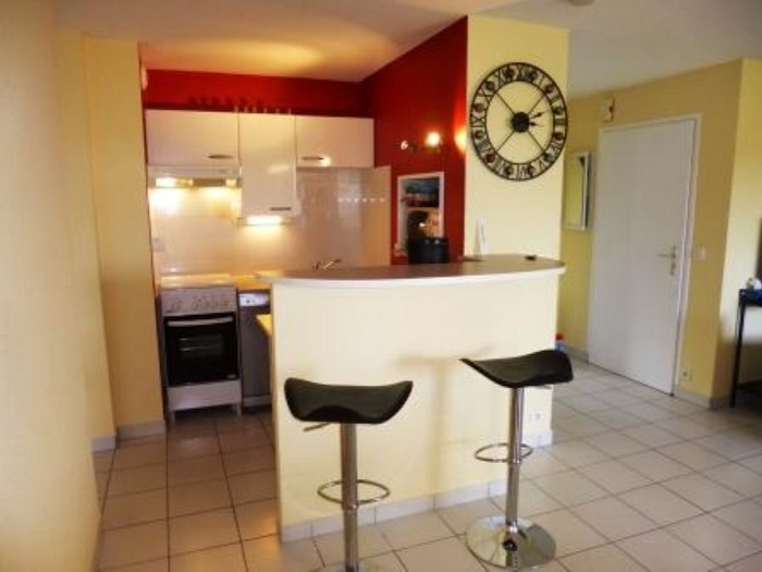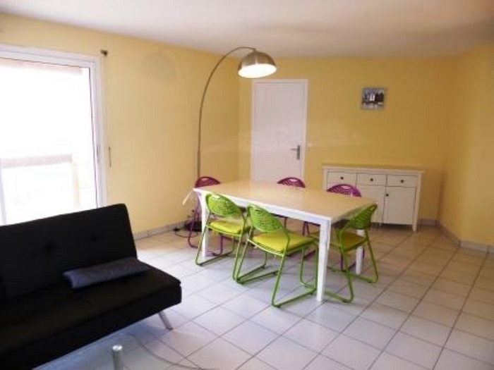 Appartement 3 Pièces 4/6 personnes en duplex, de 50m² situé au 2ème étage de la résidence, composé au rez-de-chaussée d'un séjour avec un 1 clic-clac pour 2 personnes, d'une kitchenette, d'une chambre avec un lit double, d'une salle de bains et de WC.A l'étage, une chambre avec 2 lits simples. L'appartement dispose également d'une terrasse avec salon de jardin, d'un parking et d'une cave.