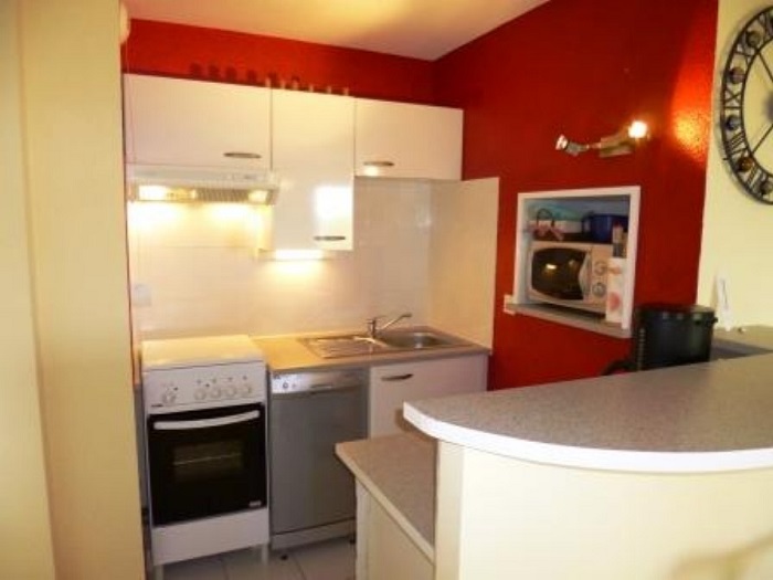 L'appartement comprend une cuisine équipée avec 2 plaques électriques, réfrigérateur, four électrique, micro-ondes et lave-linge.