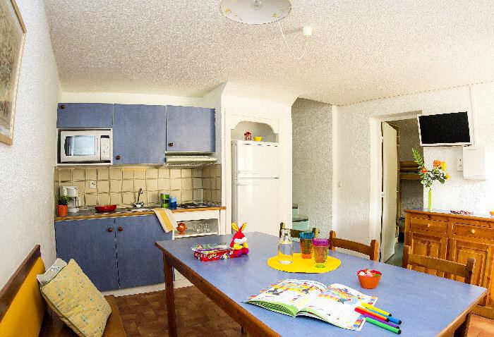 Gîte 3 Pièces 5 Personnes de 51m², composé d'une cuisine équipée, d'une chambre avec 1 lit double, d'une seconde chambre avec 2 lits superposés et un lit simple, d'une salle de bains avec douche, d'un WC indépendant et d'une terrasse indépendante.