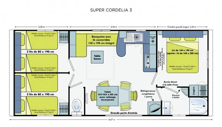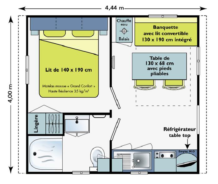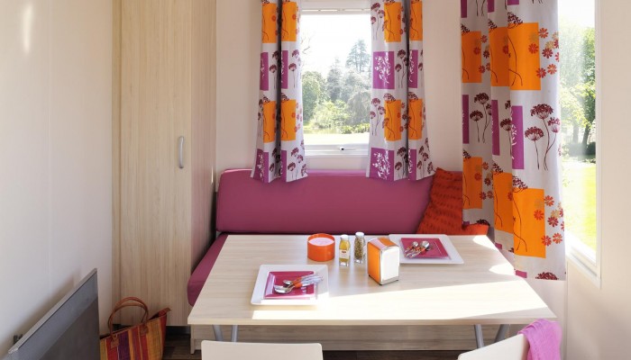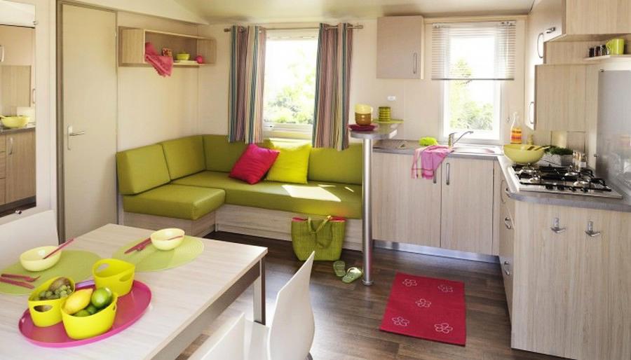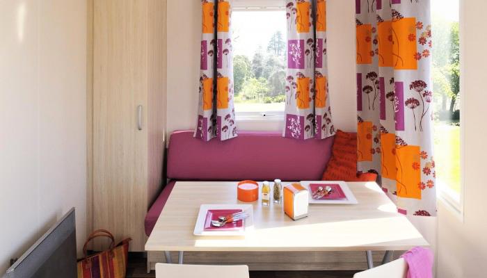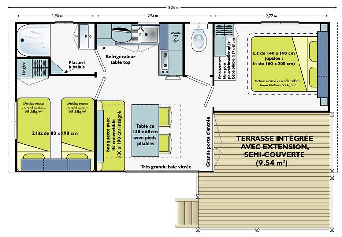 Mobil Home 3 Pièces 4 Personnes de 25m², composé d'un coin cuisine équipé, d'un coin séjour, d'une chambre avec un lit double, d'une chambre avec 2 lits simples, d'une salle d'eau, de WC séparés et d'une terrasse de 8.40m².