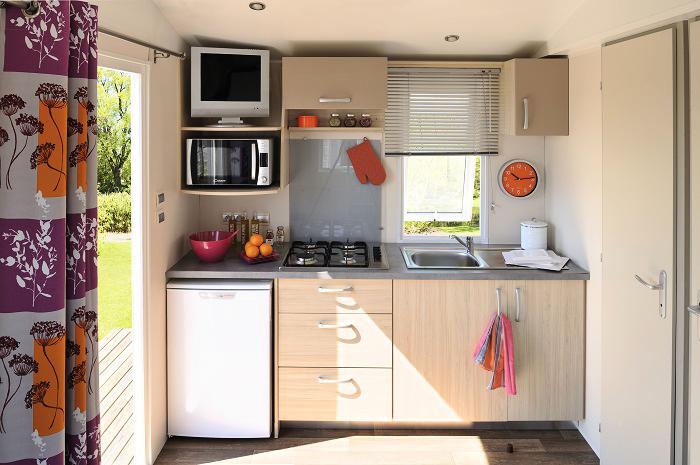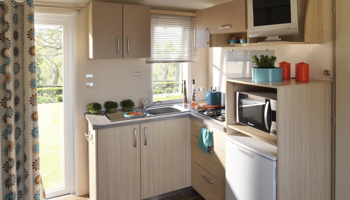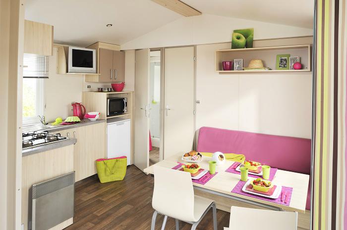 Le Mobil Home comprend un coin cuisine équipé d'un frigo, d'un micro-ondes, de 2 ou 4 feux gaz et d'ustensiles de cuisine. Le coin séjour est équipé de la télévision, les oreillers et couvertures sont fournis. La terrasse possède un salon de jardin et un barbecue.