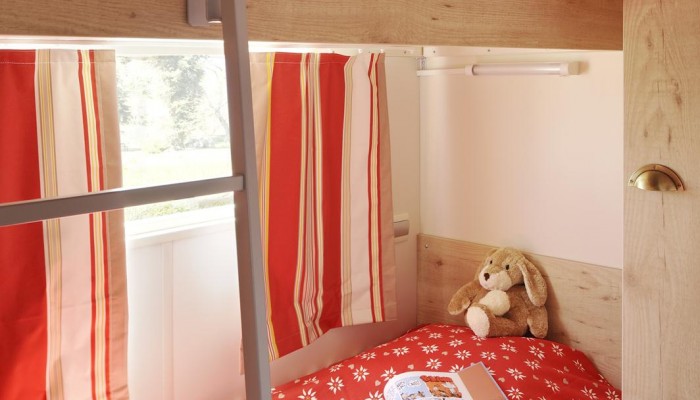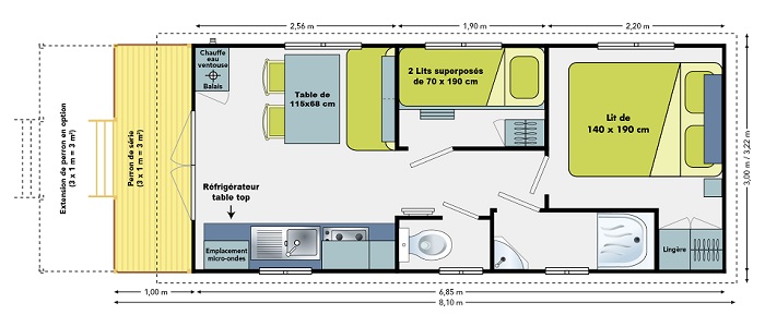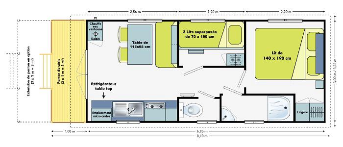 Roulotte 3 Pièces 4 Personnes de 20.4m², composé d'un coin cuisine équipé, d'un coin repas, d'une chambre avec un lit double, d'une chambre avec 2 lits superposés, d'une salle d'eau, de WC séparés et d'un perron.