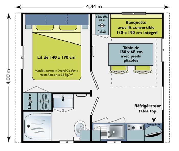 Mobil Home 3 Pièces 4 Personnes de 22.90m², composé d'un coin cuisine équipé, d'un coin séjour, d'une chambre avec un lit double, d'une chambre avec 2 lits simples, d'une salle d'eau avec WC et d'une terrasse.