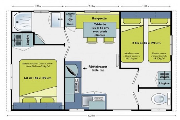 Mobil Home 4 pièces 6 personnes de 32m² environ, composé d'un coin salon, d'un coin repas séparé, d'une chambre avec un lit double (140x190), de 2 autres chambres avec deux lits simples (80x190), d'une salle de douche avec WC séparés et d'un salon de jardin.