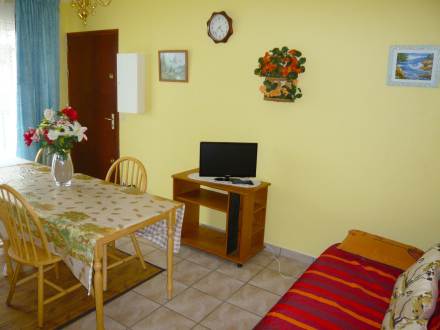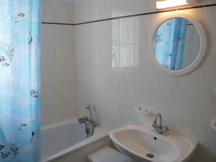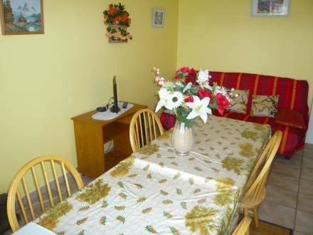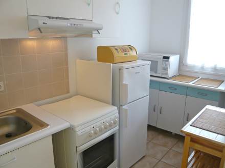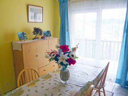 Apt 2 pièces 40 m2 au 2ème étage, situation sud-ouest: séjour/salle à manger avec 1 divan-lit double (140 cm), Télévision numérique et écran plat. Sortie sur le balcon. 1 chambre avec 1 grand-lit (140 cm). Cuisine (4 plaques de cuisson, four, four micro-ondes, cafetière électrique). Salle de bains, WC séparé. Chauffage électrique. Balcon 10 m2. Mobilier de balcon. A disposition: fer à repasser.