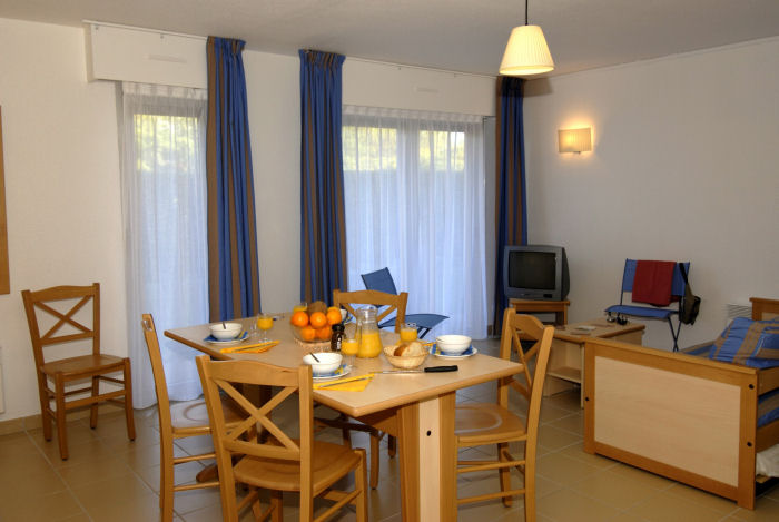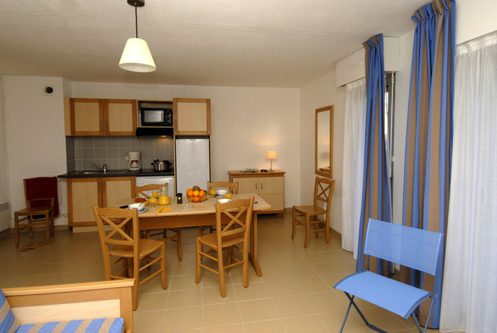 Appartement de 3 pièces de 6 personnes de 48 à 55m² environ composé - Soit d'un séjour avec 2 banquettes lits 1 personne, séparé par une porte accordéon du coin repas et sa banquette lit pour une personne. Une alcôve avec un lit simple, une chambre avec un grand lit, une kitchenette équipée et une salle de bain avec WC séparés.- Soit d'un séjour avec 2 couchages, d'un coin repas, d'une chambre avec un grand lit, d'une chambre avec 2 lits simples, d'une kitchenette équipée, d'une salle de bain avec toilettes. 2 appartements de type 2 pièces sont accessibles aux personnes à mobilité réduite ou handicapées (avec douche). il est recommandé que la personne soit accompagnée car les placards de cuisine et le micro-ondes sont en hauteur.