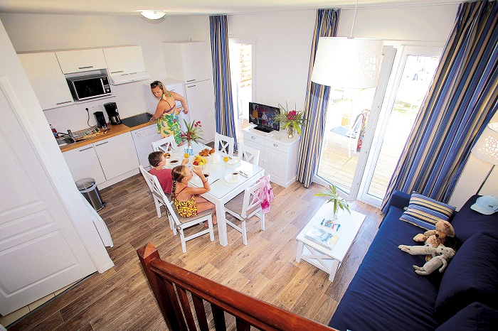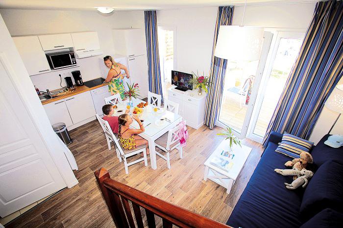 Maisonnette 3 Pièces 6 Personnes Duplex de 43m², composé d'un séjour avec 2 couchages, d'une chambre avec 1 lit double, d'une chambre avec 2 lits simples, d'une kitchenette équipée, d'une salle de douche et de WC au rez de chaussée. Terrasse.