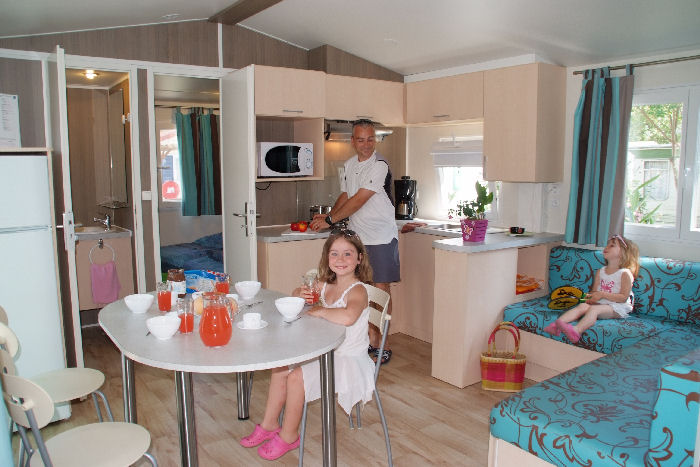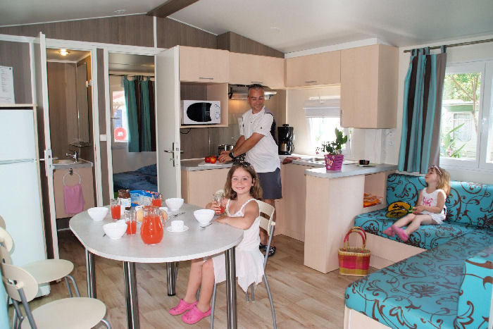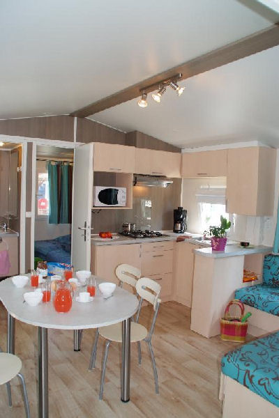 Le mobil home est équipé d'une plaque de cuisson 4 feux, d'un réfrigérateur/congélateur, d'un micro-ondes, d'une cafetière et de tous les ustensiles de cuisine.Une télévision écran plat avec lecteur DVD est également à disposition.Climatisation en option (30? / semaine).Les couvertures et oreillers sont fournis (draps jetables en option).La terrasse possède un salon de jardin.