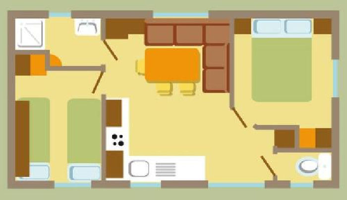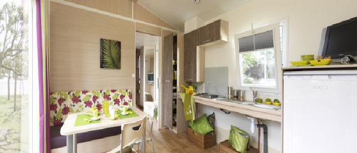 Mobil Home de 32m² environ pour 4/6 personnes, composé d'une kitchenette équipée, d'un séjour avec une banquette convertible en couchage pour 2 personnes, d'une chambre avec 2 lits simples (possibilité lit double), d'une chambre avec 2 lits superposés, d'une salle de bains avec une douche et un WC, et d'une terrasse couverte.Ancienneté : mobil-home de moins de 7 ans.Accès PMR : Ce mobil home est spécialement adaptée aux personnes à mobilité réduite : aménagement de la cuisine plus bas, salle de bains avec douche et WC adaptés, terrasse de plein pied avec rampe d'accès.