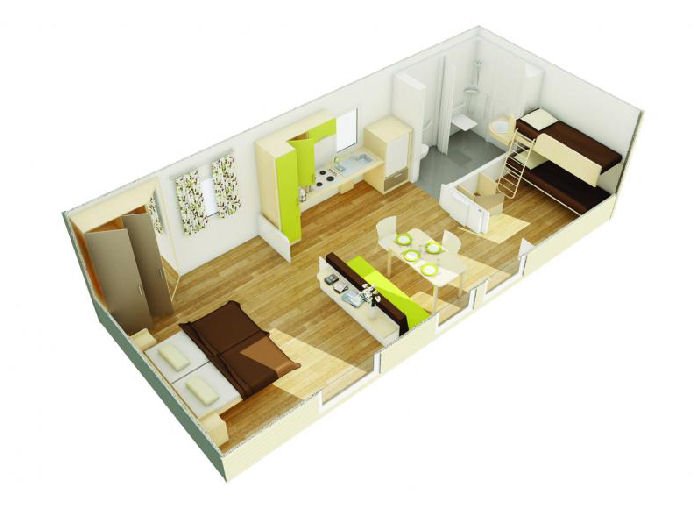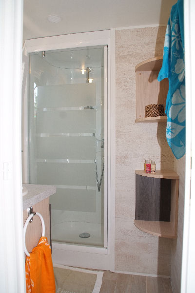 Mobil Home de 31m² environ pour 2 adultes et 3 enfants, composé d'une kitchenette équipée, d'un séjour avec un coin repas, d'une chambre avec un lit double, d'une chambre avec 2 lits superposés et un lit simple, d'une salle de bains pour chaque chambre (une douche, une baignoire), de 2 WC et d'une terrasse semi-couverte.Ancienneté : mobil-home de moins d'un an.