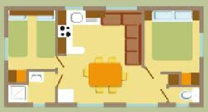 Mobil Home de 30m² environ pour 4/6 personnes, composé d'une kitchenette équipée, d'un séjour avec une banquette convertible en couchage pour 2 personnes, d'une chambre avec un lit double, d'une chambre avec 2 lits simples, d'une salle de bains avec une douche, d'un WC séparé et d'une terrasse semi-couverte. Ancienneté : mobil-home de moins de 7 ans.