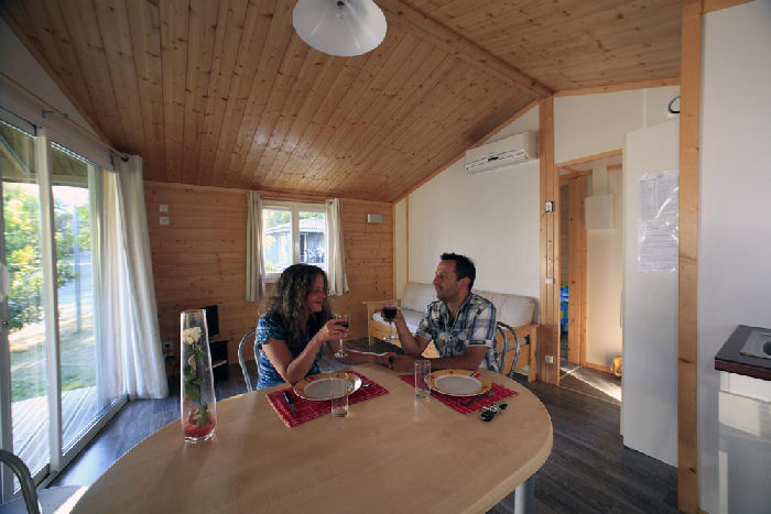 Le chalet est équipé de 4 plaques chauffantes électriques, d'un réfrigérateur avec une partie congélateur, d'une cafetière, d'un four micro-ondes, d'une hotte aspirante, d'un lave-vaisselle, d'une télévision et de la climatisation (payant) dans le salon.Chaque chambre possède des rangements et une penderie.Les couettes et les oreillers sont fournis, des protège-matelas et protège-oreillers vous seront remis lors de votre arrivée. La terrasse est équipée d'un salon de jardin pour 6 personnes.