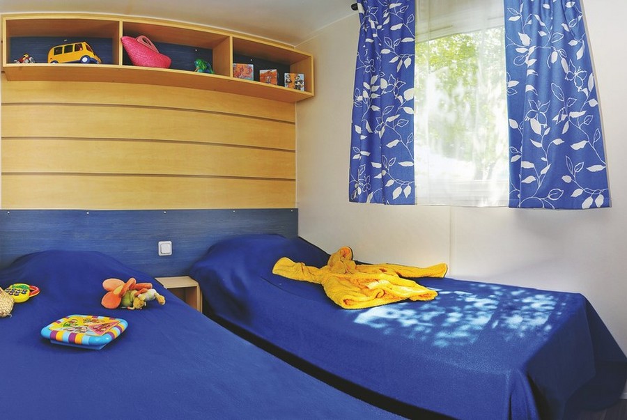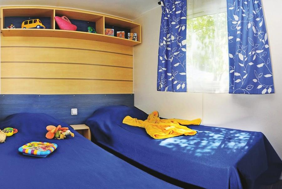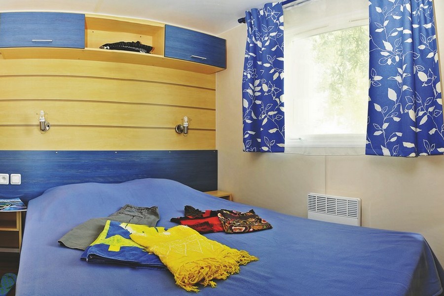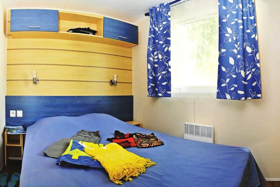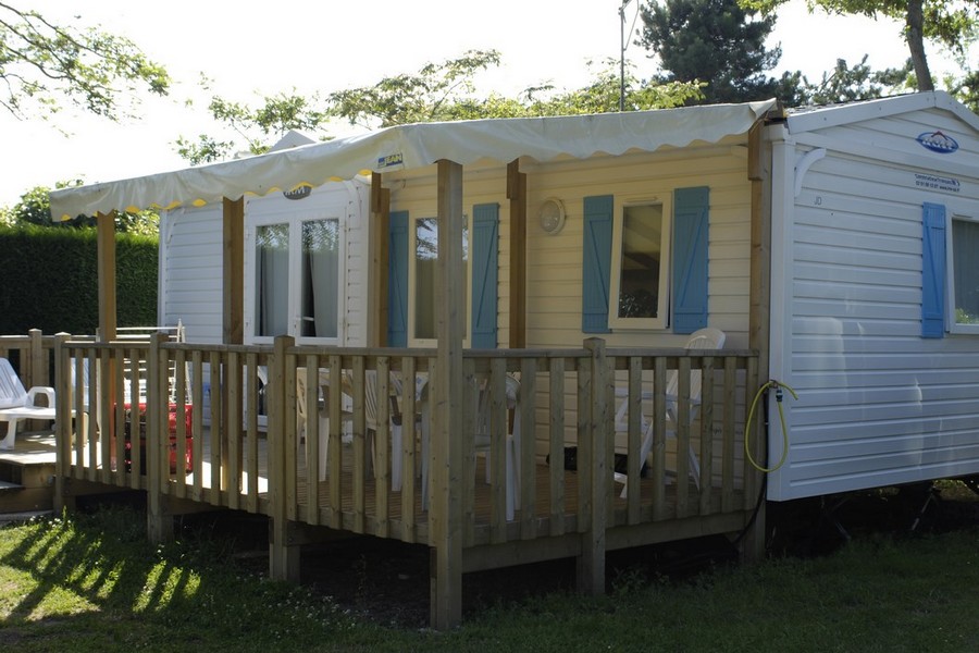Mobil Home d'environ 28m² pour 4/6 personnes, composé d'un séjour avec banquette- convertible en lit pour 2 personnes (140x190), d'un coin cuisine équipé, d'une chambre avec 1 lit double (140x190), d'une chambre avec 2 lits simples (80x190), d'une salle de bains avec lavabo et douche, de WC séparés et d'une terrasse couverte intégrée.Année: 2010
