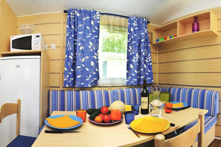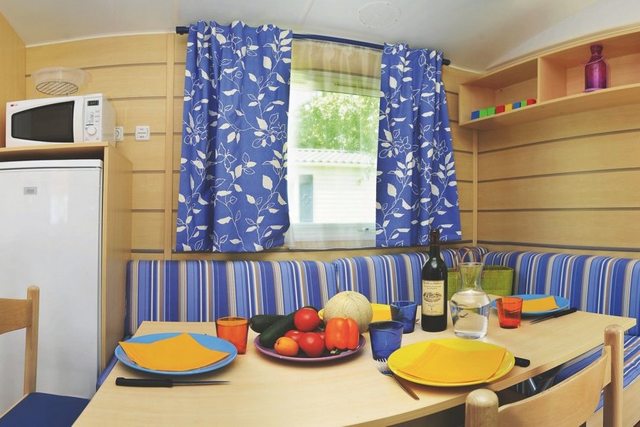 Le mobil home dispose d'un coin cuisine équipé avec plaque de cuisson 4 feux au gaz, réfrigérateur/congélateur, micro-ondes, cafetière électrique ainsi que tous les ustensiles de cuisine nécessaires et la vaisselle.