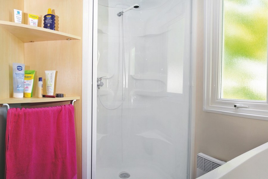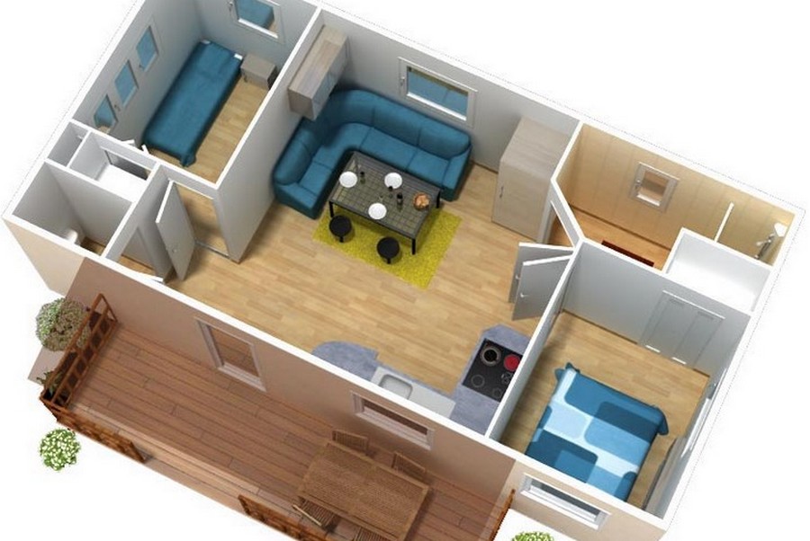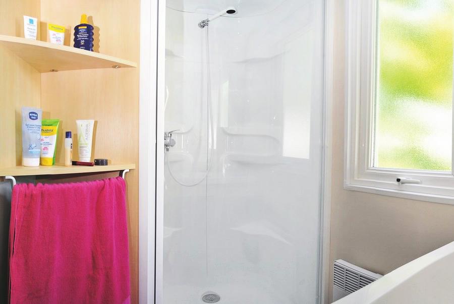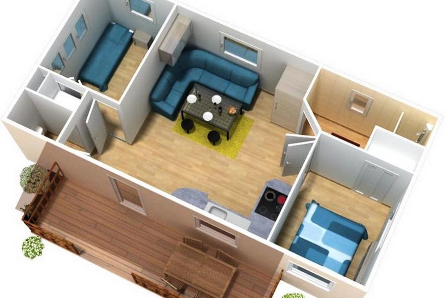 Mobil Home d'environ 28m² pour 4/6 personnes, composé d'un séjour avec banquette- convertible en lit pour 2 personnes (140x190), d'un coin cuisine équipé, d'une chambre avec 1 lit double (140x190), d'une chambre avec 2 lits simples (80x190), d'une salle de bains avec lavabo et douche, de WC séparés et d'une terrasse couverte intégrée. Année: 2010