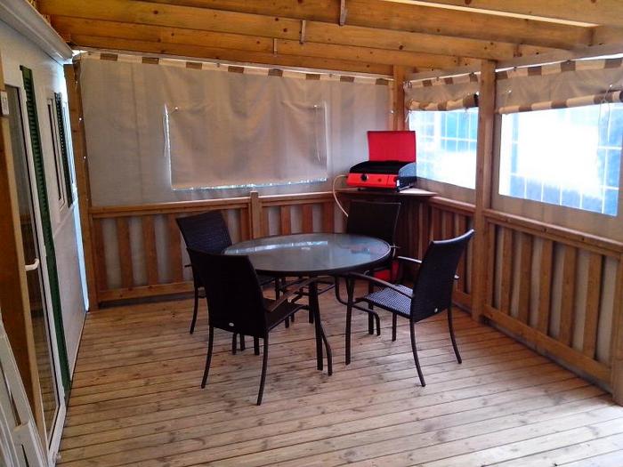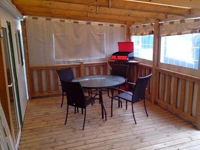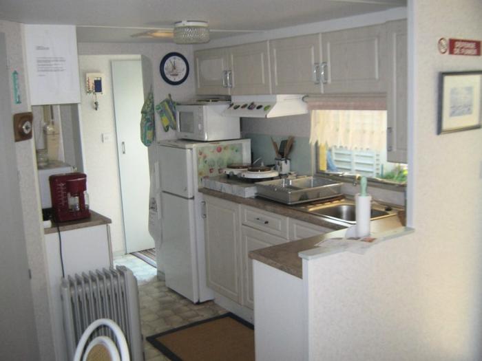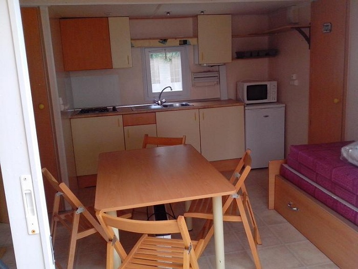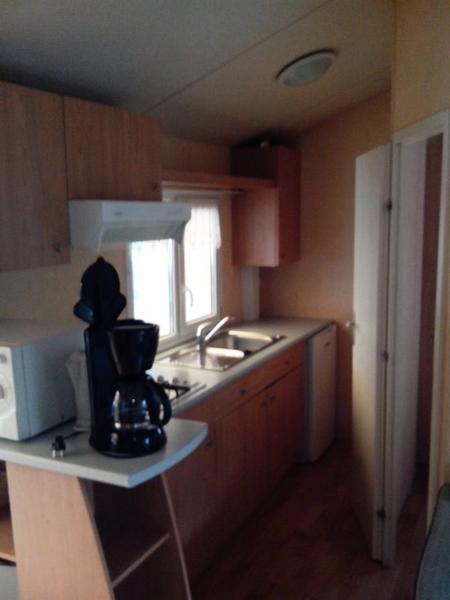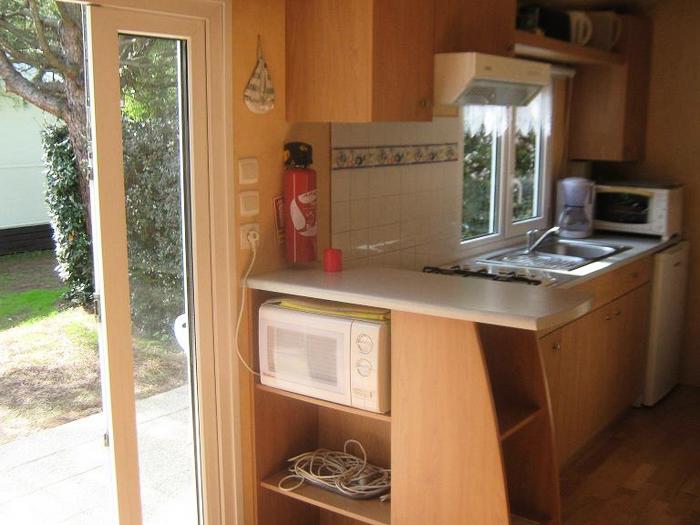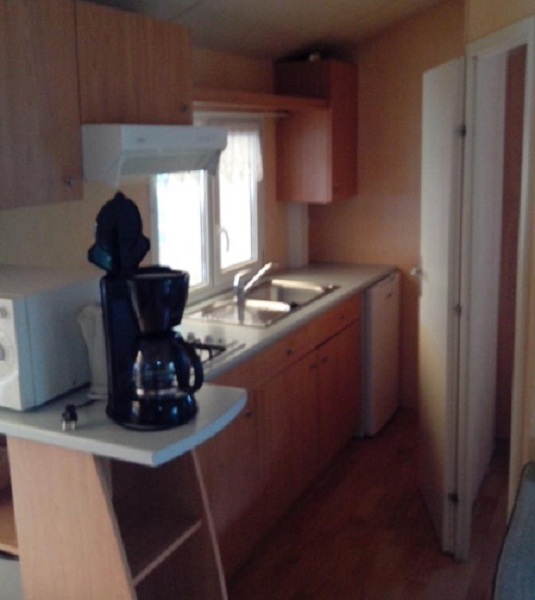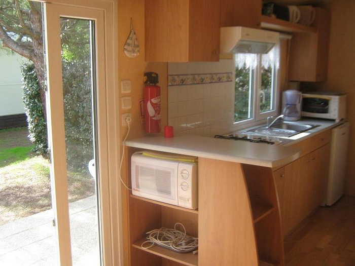 Le mobil-home comprend une kitchenette équipée d'un grand réfrigérateur, de plaques de cuisson 4 feux au gaz, d'un micro-onde, d'une cafetière électrique, des ustensiles de cuisine et vaisselle. Chaque couchage inclut les oreillers et les couettes (draps jetables en option). La terrasse dispose d'un salon de jardin. Le mobil-home est également équipé d'une télévision et d'un barbecue électrique ou plancha.
