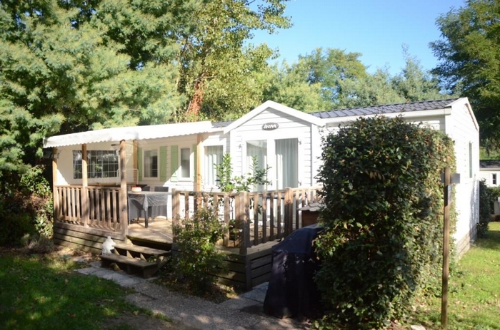 Mobil-home 4 pièces 6 personnes de 31m² composé d'un séjour, d'un coin repas, d'une kitchenette équipée, d'une chambre avec un lit double (140x190), de deux autres chambres avec deux lits simples (80x190) chacune, d'une salle de douche avec lavabo, de WC séparés et d'une terrasse couverte avec salon de jardin.