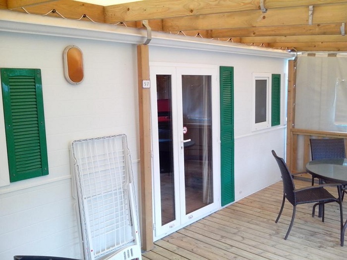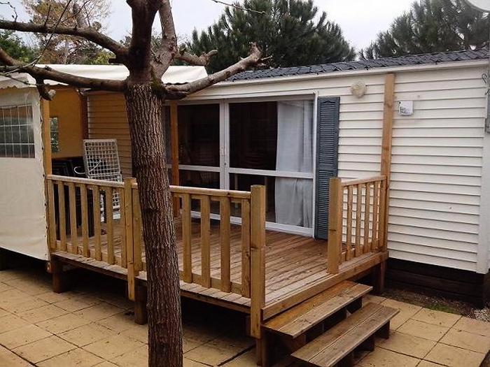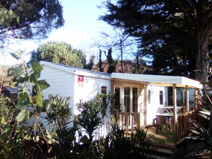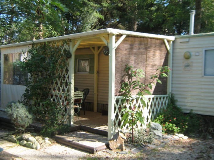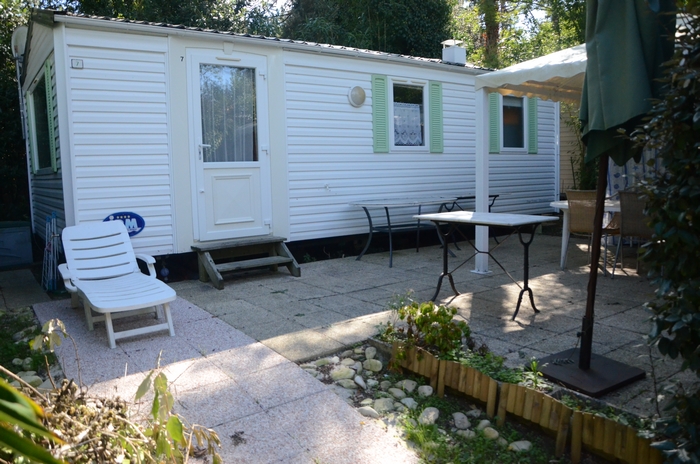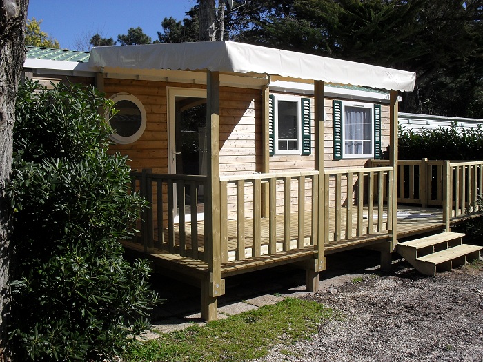 Mobil-home 3 pièces 4 personnes de 27m² composé d'un séjour, d'un coin repas, d'une kitchenette équipée, d'une chambre avec un lit double, d'une seconde chambre avec deux lits simples, d'une salle de douche avec WC intégrés et d'une terrasse semi-couverte.