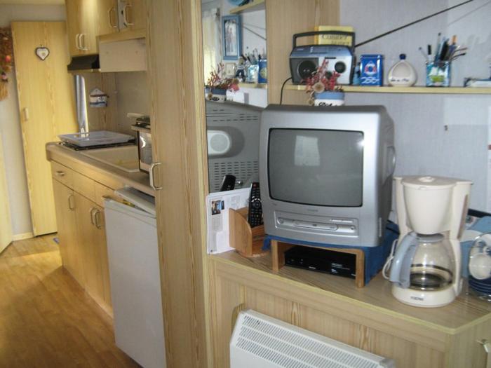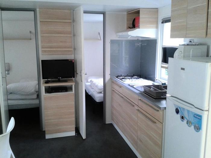 Le mobil-home comprend une kitchenette équipée d'un réfrigérateur/freezer, de plaques de cuisson, d'un micro-onde, d'une cafetière électrique, des ustensiles de cuisine et vaisselle. Chaque couchage inclut les oreillers et les couettes (draps jetables en option). La terrasse dispose d'un salon de jardin. Le mobil-home est également équipé d'une télévision et d'une plancha ou barbecue électrique.