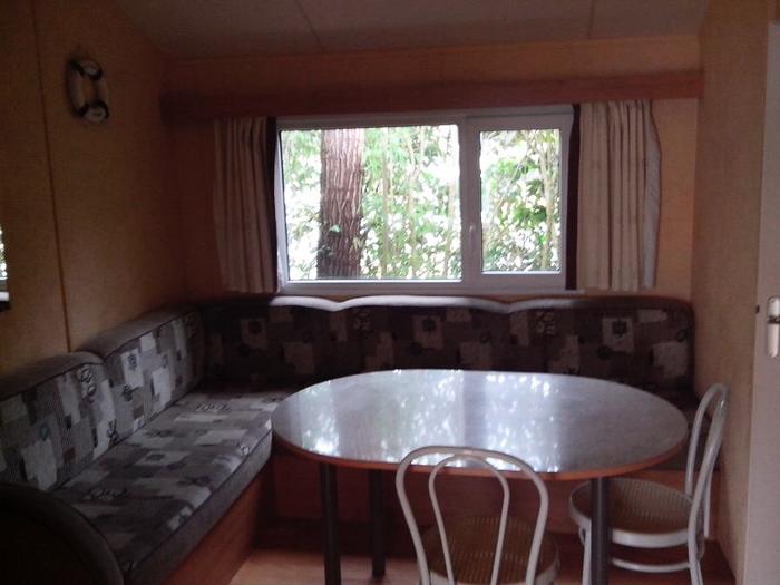 Mobil-home 3 pièces 4 personnes de 28m² composé d'un séjour avec une banquette convertible pour deux personnes, d'un coin repas, d'une kitchenette équipée, d'une chambre avec un lit double, d'une seconde chambre avec deux lits simples, d'une salle de douche avec WC intégrés et d'une terrasse au sol non couverte.