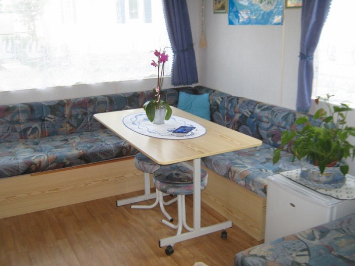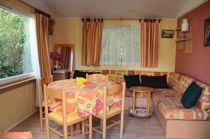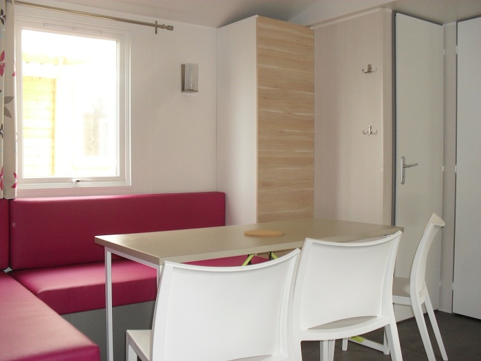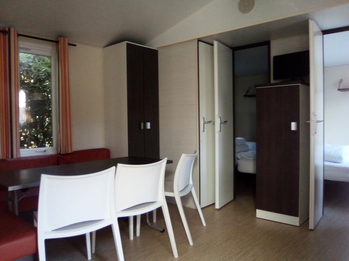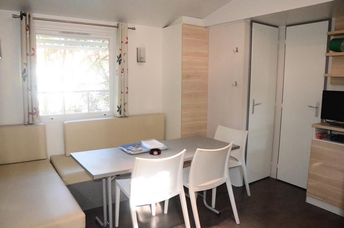 Mobil-home 3 pièces 4 personnes de 28m² composé d'un séjour avec une banquette convertible pour deux personnes, d'un coin repas, d'une kitchenette équipée, d'une chambre avec un lit double, d'une seconde chambre avec deux lits simples, d'une salle de douche avec WC intégrés et d'une terrasse semi-couverte.