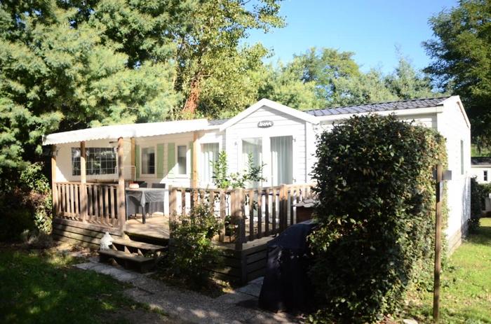 Mobil-home 3 pièces 4/6 personnes de 28m² composé d'un séjour avec une banquette convertible pour deux personnes, d'un coin repas, d'une kitchenette équipée, d'une chambre avec un lit double, d'une seconde chambre avec deux lits simples, d'une salle de douche avec WC intégrés et d'une terrasse avec un espace couvert ou semi-couvert.