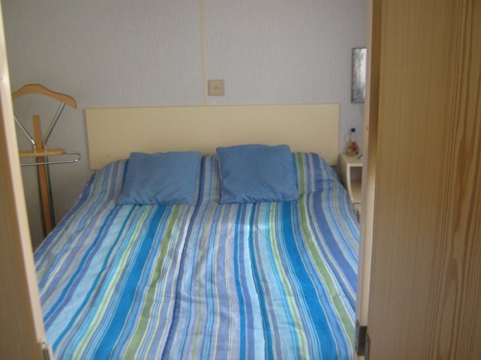 Mobil-home 3 pièces 4 personnes de 27m² composé d'un séjour, d'un coin repas, d'une kitchenette équipée, d'une chambre avec un lit double, d'une seconde chambre avec deux lits simples, d'une salle de douche avec WC intégrés et d'une terrasse non couverte.