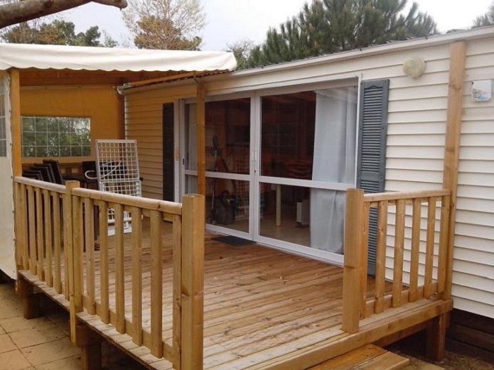 Mobil-home 4 pièces 6/8 personnes de 31m² composé d'un séjour avec une banquette convertible en lit double pour deux personnes, d'un coin repas, d'une kitchenette équipée, d'une chambre avec un lit double, de deux autres chambres avec deux lits simples chacune, d'une salle de douche avec WC séparés et d'une terrasse parfois semi couverte.