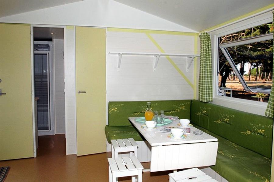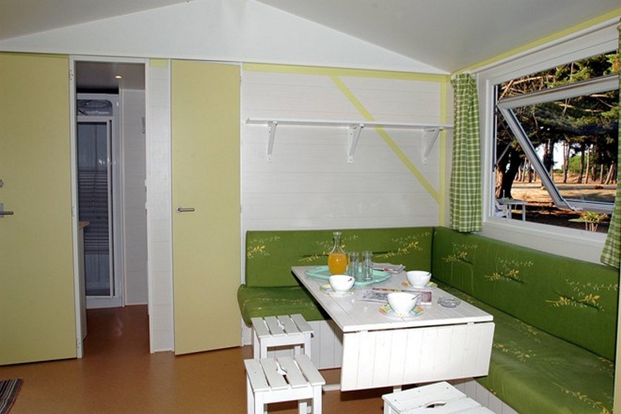 Mobil Home de 27m² pour 4 à 6 personnes composé d'un salon avec banquettes transformables en couchette double, d'une chambre avec un grand lit, d'une chambre avec 2 lits simples, d'un coin cuisine équipé, et d'une salle de douche avec WC séparés. Capacité maximum 6 personnes bébé inclus.