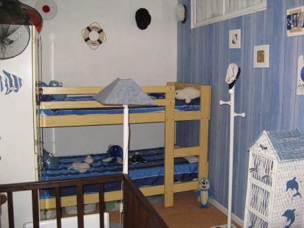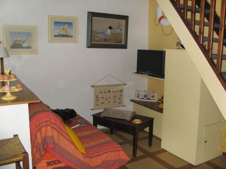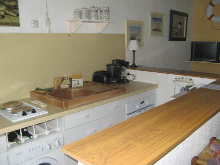 "Les Tillieuls", maison mitoyenne 2 pièces 40 m2 sur 2 niveaux, aménagement simple et fonctionnel: séjour/salle à manger 24 m2 avec table pour les repas et TV. Cuisine ouverte (2 plaques de cuisson, four, lave-vaisselle, four micro-ondes, cafetière électrique) avec bar. À l'étage supérieur: galerie avec 1 x 2 lits superposés (90 cm). 1 chambre avec 1 grand-lit (1 x 140 cm, longueur 190 cm). Douche/WC. A disposition: lave-linge, chaise haute pour enfant, lit bébé. Veuillez noter: logement côté rue.