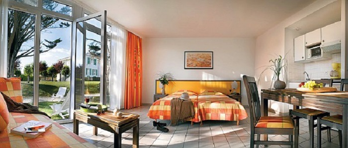 Studio pour deux personnes de 26 à 31m² comprenant un séjour avec deux lits simples, une salle de bains et des toilettes séparés dans la plupart des appartements.Certains de ces studios sont accessibles aux personnes à mobilité réduite, nous contacter.