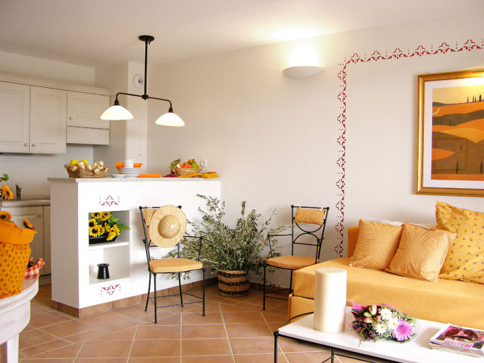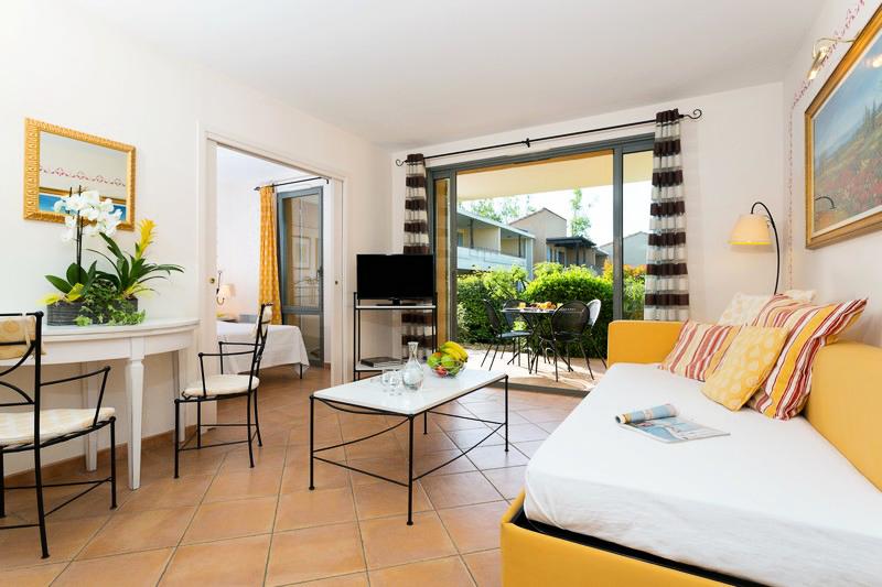 Appartement entre 38 et 40m² pour 2/4 personnes, composé d'une kitchenette équipée, d'un séjour avec un canapé lit gigogne pour 2 personnes, d'une chambre avec 2 lits simples, d'une salle de bains, des wc et d'un jardin avec terrasse ou d'un balcon.