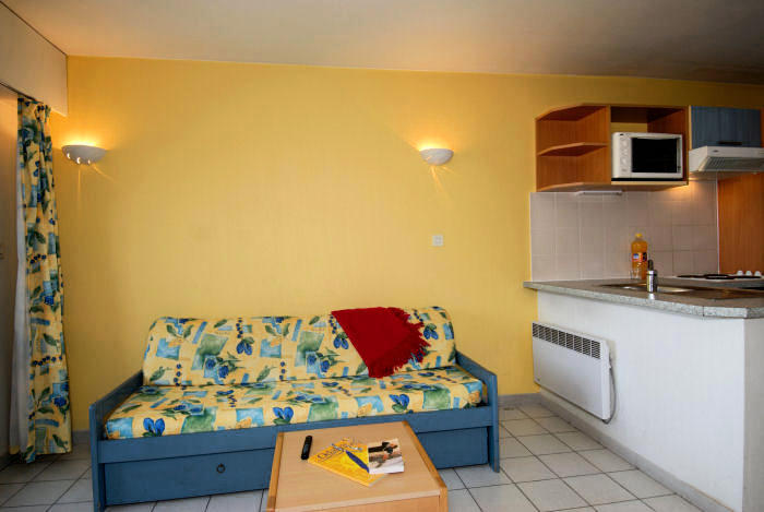 Studio pour 4 personnes composé d'un séjour avec un lit banquette et un lit banquette gigogne, d'un coin chambre avec un lit double ou 2 lits simples, d'une kitchenette équipée, d'une salle de bain avec WC.